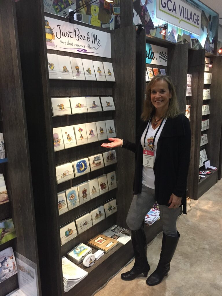 I went back to my love of fine arts and painting. I took some classes, joined the South Shore Art Center, the Weymouth Art Association, the North River Art Association, and started entering gallery shows. I did the circuit for quite a few years, going to openings, etc. until the summer of 2010. I was working on an idea for an garden themed show, when the ‘bees’ came into my life. They were literally crossing my path and entering my life daily, until the image of a little fat bee meditating came to me, ‘Bee In The Moment’. All of my worlds and experience seemed to come together at that time. The image of my father letting bumble bees crawl across his hands when I was a little girl, to show me not to be afraid, came flashing back. The fact that in recent years I had heard that our bees were struggling in our environment. The yearning to use my talent in creating artwork that would touch people’s lives and ‘make a difference’. My passion for yoga, nature and environmental concerns, it all came together. I would create a line of inspirational, yet whimsical greeting cards with cute little bees doing silly things, like yoga poses. I would use biodegradable packaging, recycled paper and donate a portion of my proceeds to the ‘Save The Honeybee Foundation’.